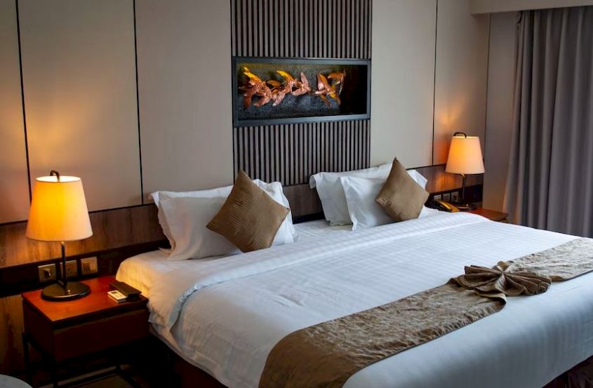 • A cozy hotel room featuring a large bed with white and brown linens, flanked by two lamps. A decorative artwork is above the bed.