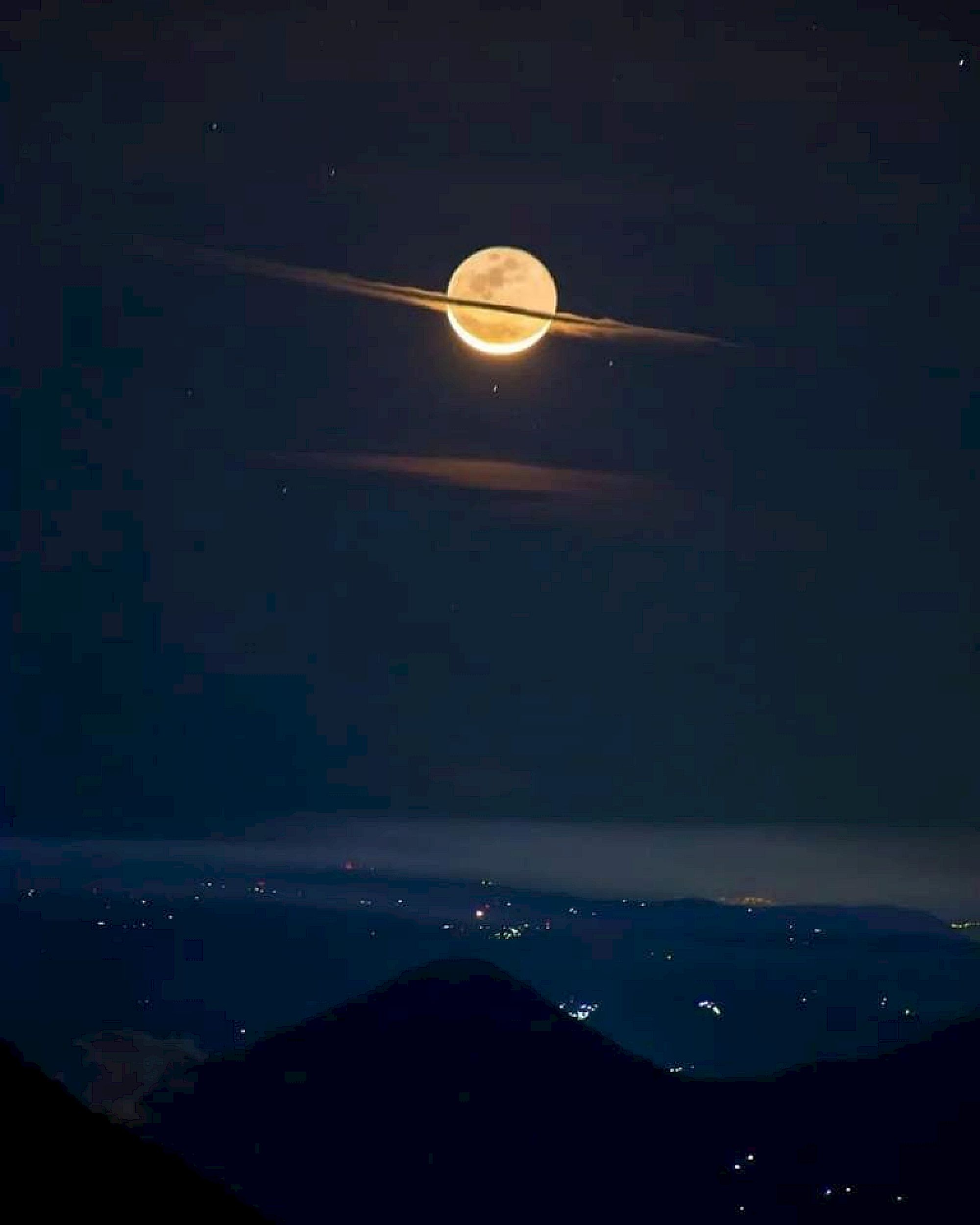 A mountain range bathed in red light under a cloudy sky at sunset.