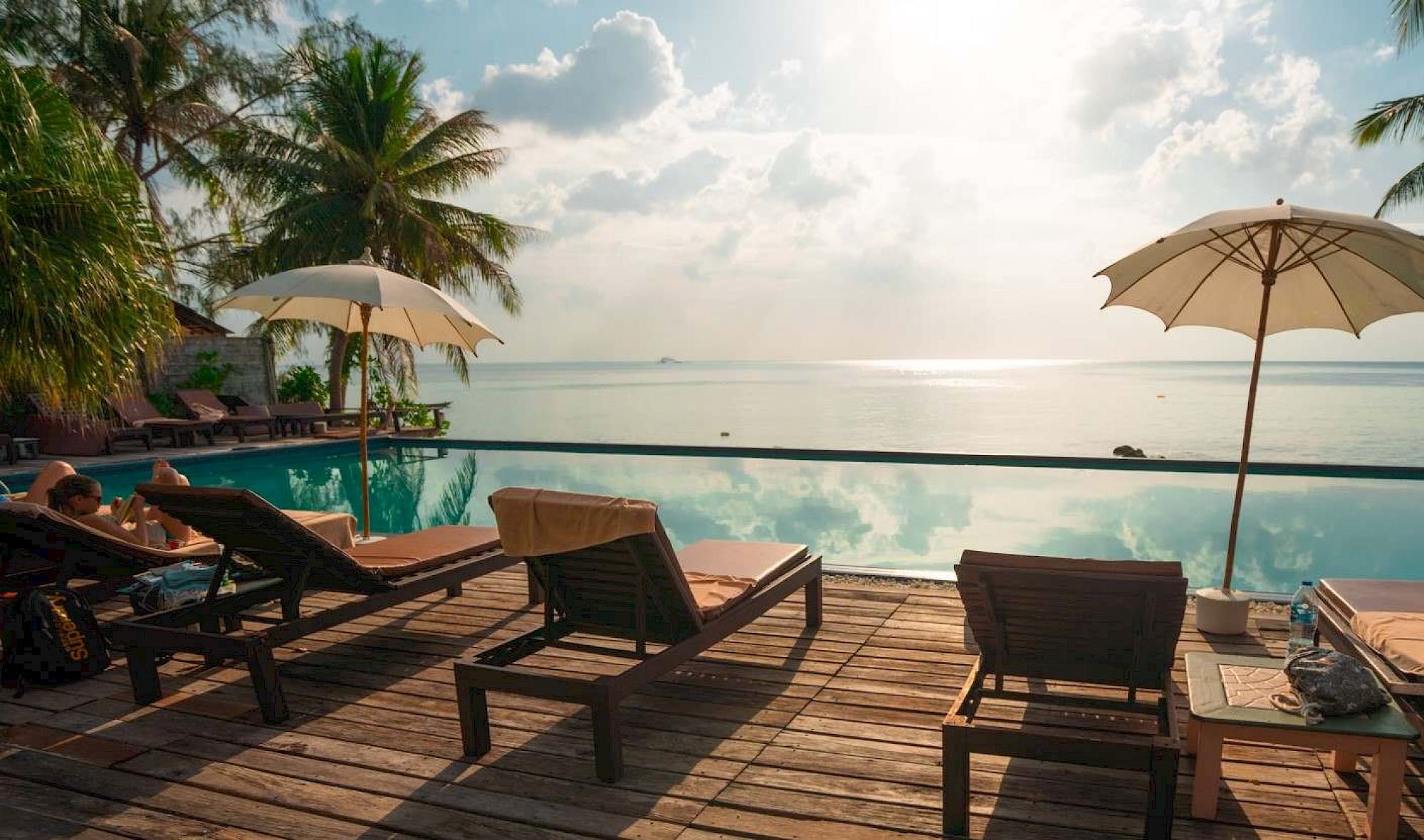 • A serene poolside scene with loungers, umbrellas, palm trees, and a calm sea under a partly cloudy sky in the sunlight.