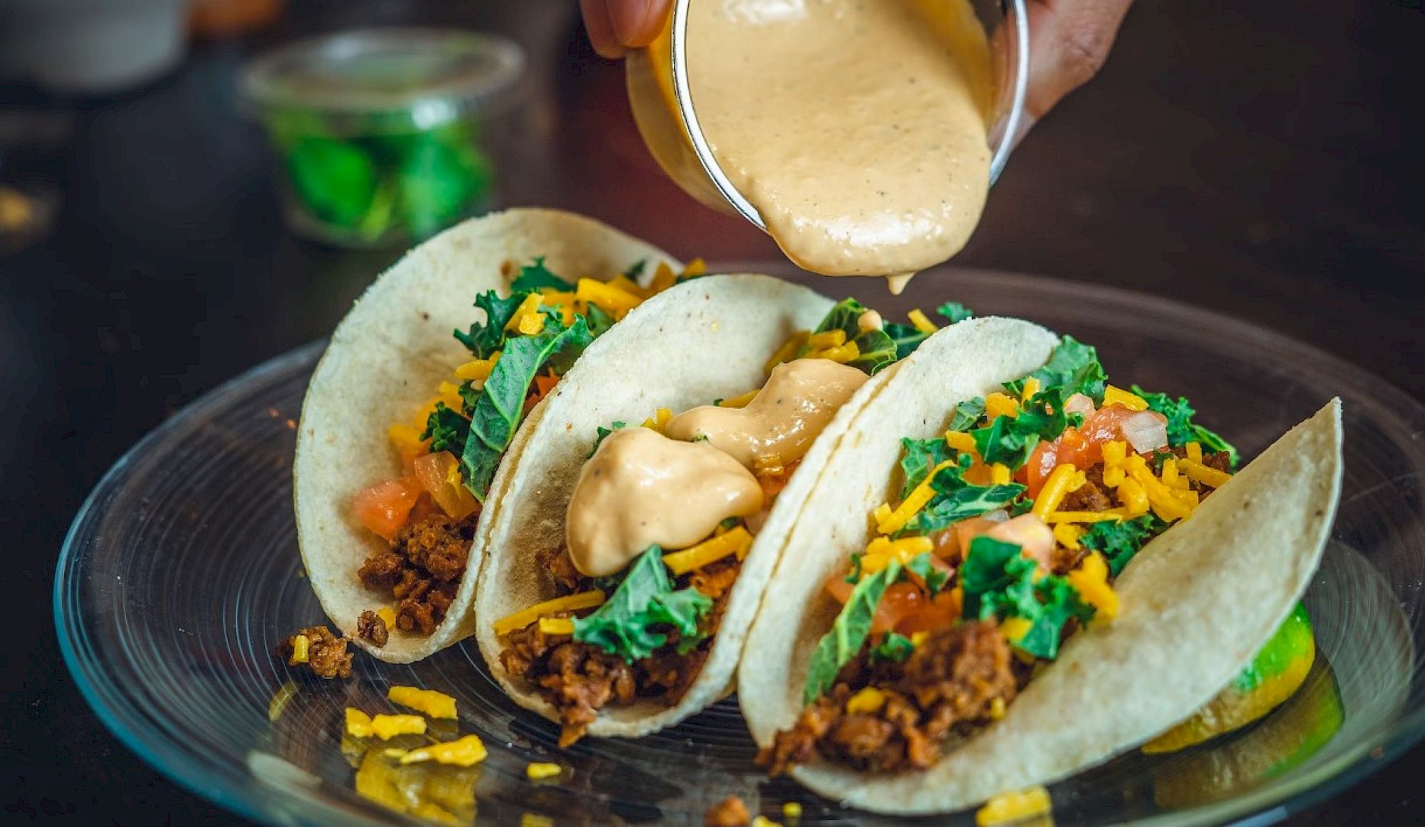 Three tacos loaded with ground meat, cheese, lettuce, and tomatoes have sauce being poured over them on a plate.