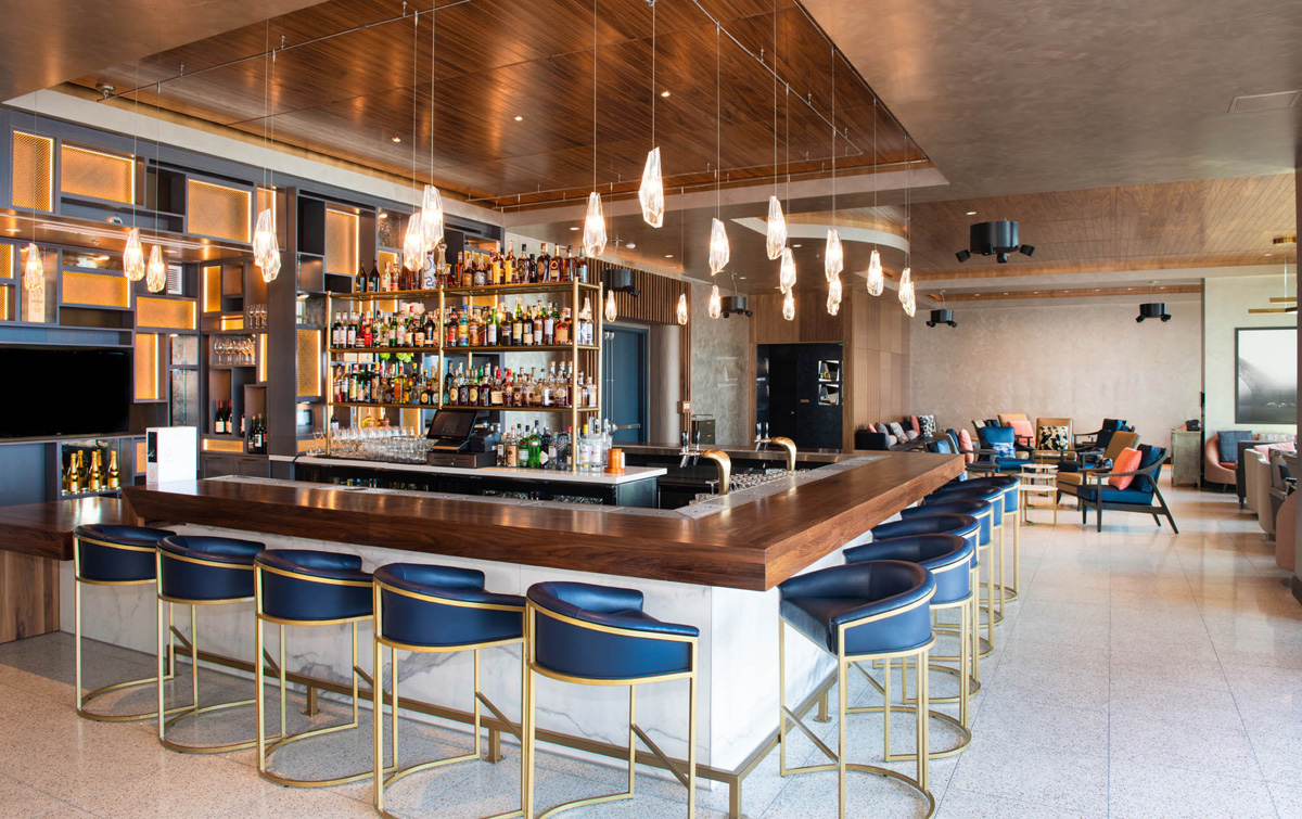A modern bar with blue stools, pendant lights, and well-stocked shelves, adjacent to a lounge area with seating.