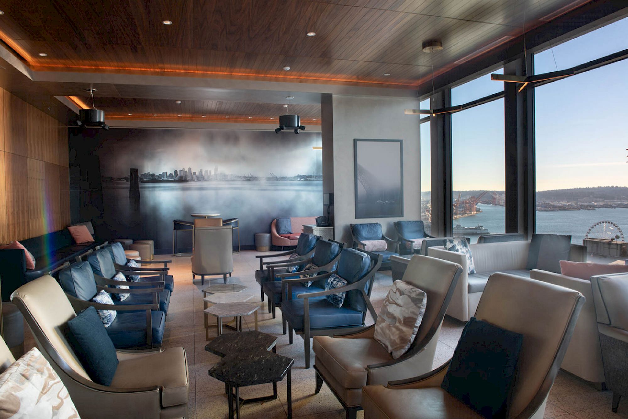 The image shows the Seattle skyline with the Space Needle prominently in the foreground against a backdrop of modern skyscrapers.
