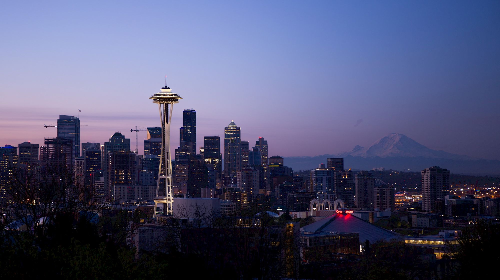 Seattle skyline at dusk with the Space Needle, city buildings, and Mount Rainier in the background, under a clear blue-purple sky.